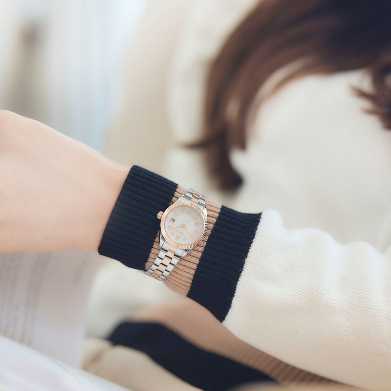 ダイヤモンドカットされたベゼルが腕元を華やかに彩ります。 星状のクリスタルを使用したインデックスや、ツートンカラーのブレスもポイント。 また、ブレスにマット加工を施すことで落ち着きのある印象を演出します。