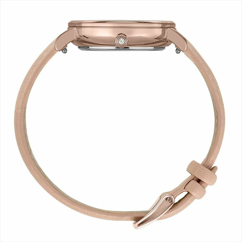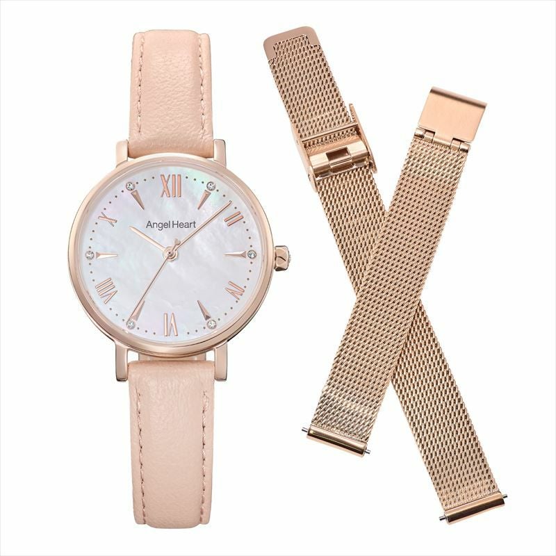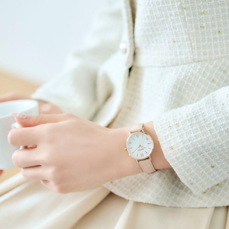 インデックスとリューズのトップにさりげなくクリスタルをセット。1秒単位に目盛りが刻まれているので、時間の見やすさが抜群。文字盤の天然パールは光の当たり具合で七色に輝き様々な表情を楽しめます。ガラスは傷がつきにくいサファイアガラスを使用。工具不要で簡単に付け替え可能なメッシュベルトがセットになっているため、その日のシーンや気分に合わせてお楽しみいただけます。