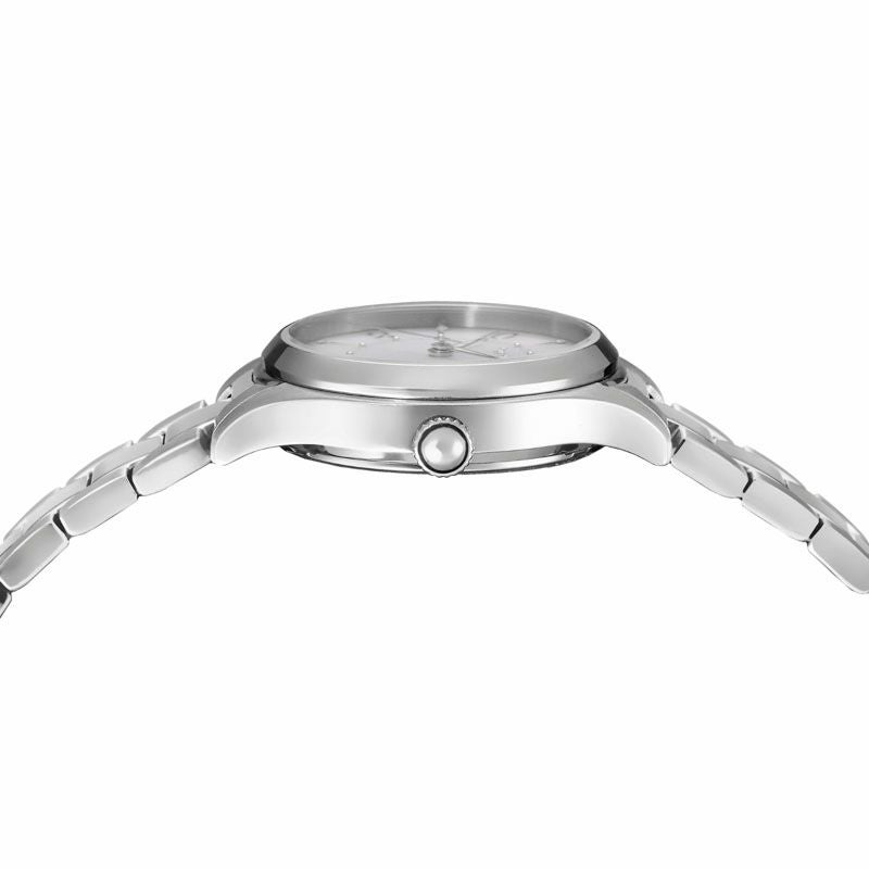 シーズンレスでオンオフ問わずご着用いただきやすい1本です。 スタッズやクリスタルを採用した大小さまざまなインデックスによってシンプルと洒落感を兼ね備えたデザインがポイント。 大人の気品や余裕を与えるような洗練されたシルバーカラーモデルは就職活動や通勤通学シーンにベストマッチします。 しなやかなラインのブレスレットはポリッシュ仕上げとマット仕上げのコンビネーションにすることで高級感のあるデザインに。 日本製ソーラームーヴメント搭載で電池交換が不要なのも嬉しいポイントです。
